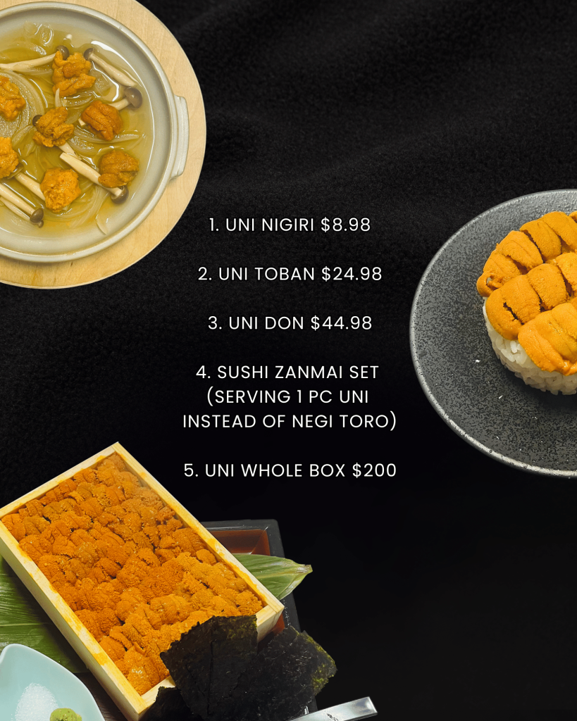 Experience a variety of exclusive Uni dishes, crafted with the finest sea urchin sourced from Japan and beyond. Don’t miss this limited-time event to indulge in the rich